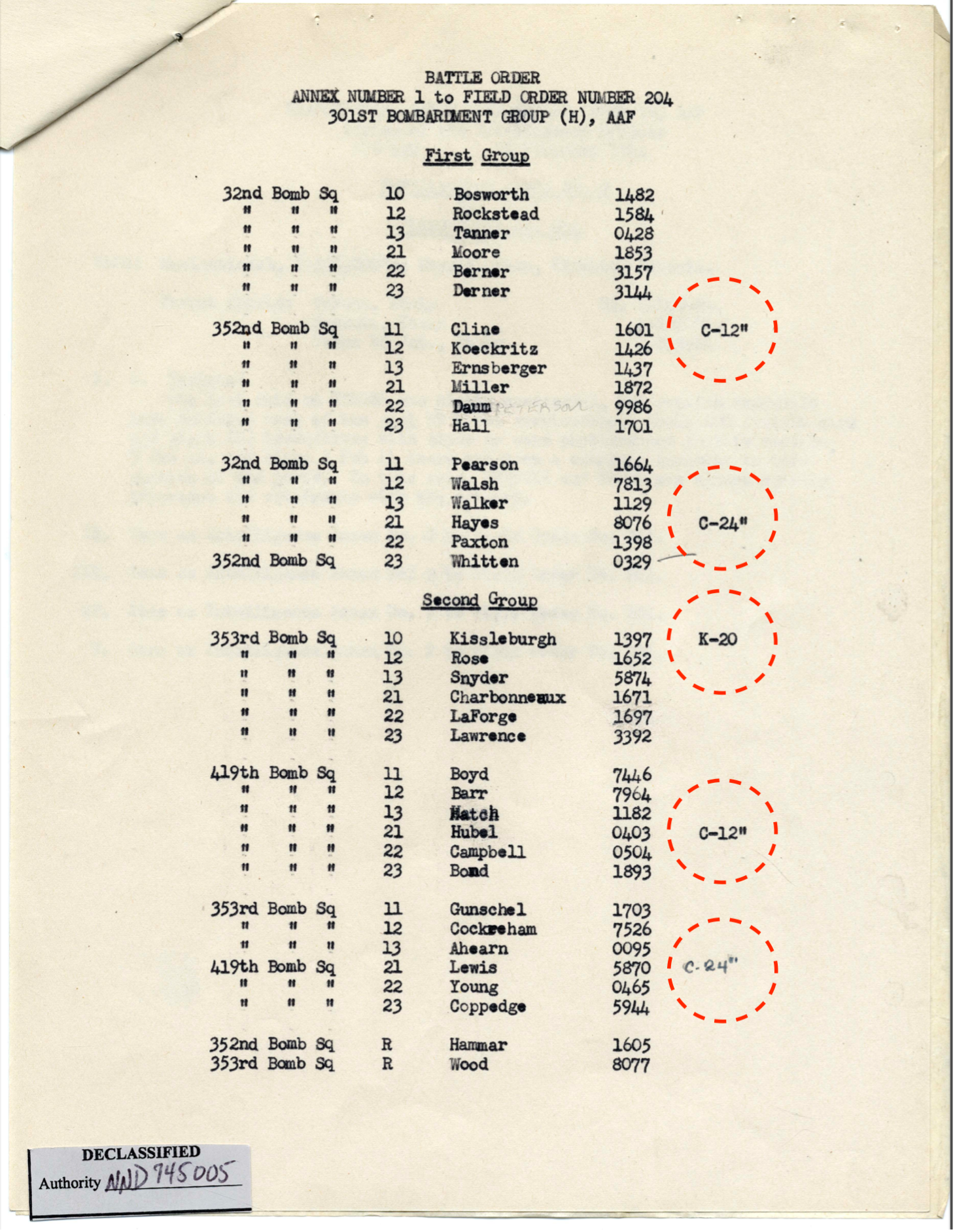 Nel documento NARA RG18, entry 7a, box 757 – MISSION NUMBER 225. Hq, 301st Bomb Gp. (H), AAF A.P.O.520 1200A, 14 February 1944 – BATTLE ORDER ANNEX NUMBER 1 to FIELD ORDER NUMBER 204, sono riportati i codici (cerchio tratteggiato in rosso) che indicano il tipo di macchina fotografica o da ripresa installata sullo specifico velivolo.