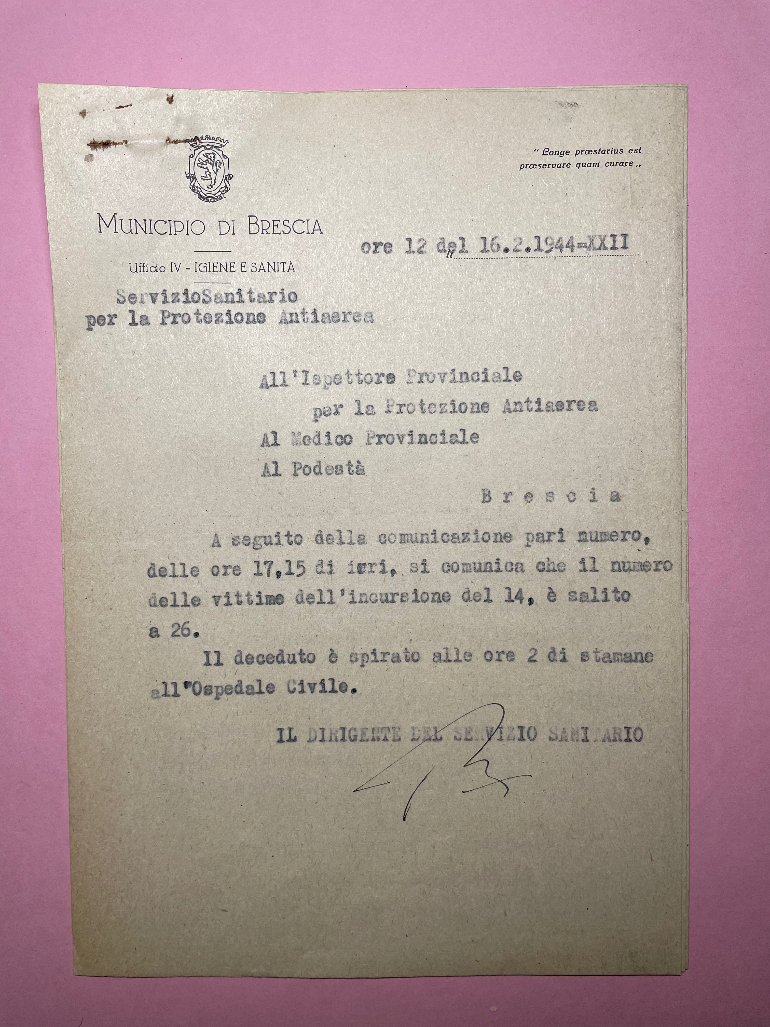 Quel giorno, sentito l’allarme, tutti i famigliari raggiunsero il “ricovero” tramite una capezzagna che fiancheggiava uno dei campi che coltivavano, parallela per un tratto a via San Zeno. Questo campo era delimitato sul lato sud da un grande fosso irriguo, asciutto in quel momento ed abbastanza ampio e profondo da garantire una relativa sicurezza. Tra le persone che si rifugiarono in quel luogo vi era la moglie Iolanda e la piccola Angela; il figlioletto, Piero, quel giorno si era recato a Bedizzole con uno zio. Giacomo però si trattenne presso la cascina in quanto alcuni militari tedeschi, che stavano abbandonando la stazione a causa dell’allarme aereo, erano giunti in cascina e lui voleva assicurarsi che se ne andassero senza che si “portassero” nulla. Una volta che gli “ospiti” se ne furono andati inforcò la bicicletta e si diresse verso il ricovero seguendo la stessa capezzagna percorsa qualche momento prima dai suoi familiari.1 Durante il tragitto verso il ricovero iniziarono a cadere le bombe ed una gli esplose vicino; lo spostamento d’aria lo scaraventò lontano ferendolo gravemente. Terminato il pericolo venne soccorso, caricato su un carretto della società di trasporti F.E.R.T. e trasportato all’ospedale dove fu ricoverato.